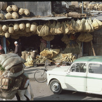 واجهة محل يبيع سلال من الخيزران وحمار يجرّ بضائع في الشارع