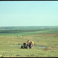 مزارع يسقى المحاصيل بإستخدام الجَرَّار