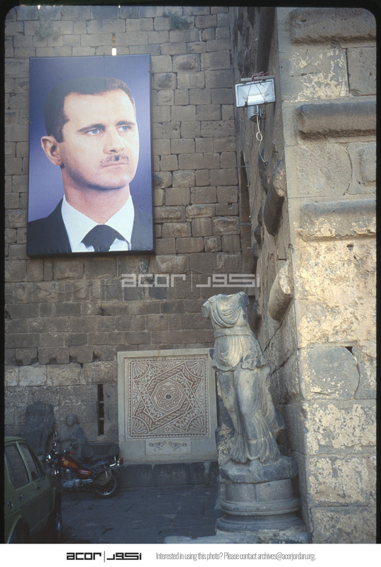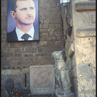 ملصق بشار الأسد فوق فسيفساء قديمة وتمثال