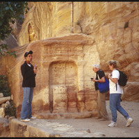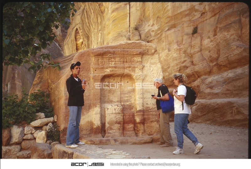 Tourists in front of Nabataean betyl in Petra