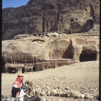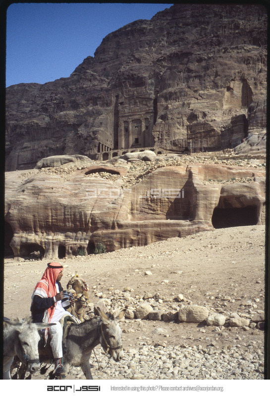 Facade of the urn tomb in Petra, and a Bedouin man riding a donkey