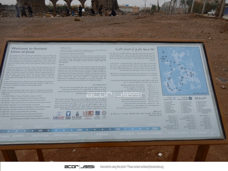 Jordan. Umm al Jimal, welcome sign with West Church in background