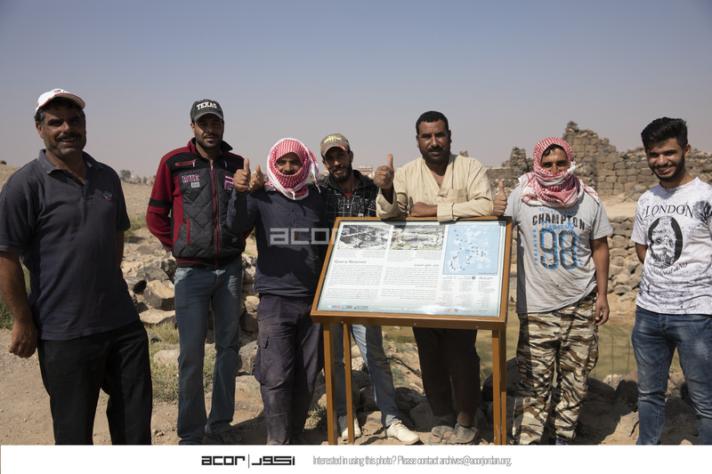 Jordan. Umm al Jimal, workers, foreman Ali Al Masaeed, Na'el Aqeel Al Masaeed, other local workers, and site steward Jehad Suleiman on far right, in front of Quarry Reservoir interpretive sign
