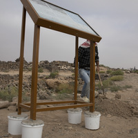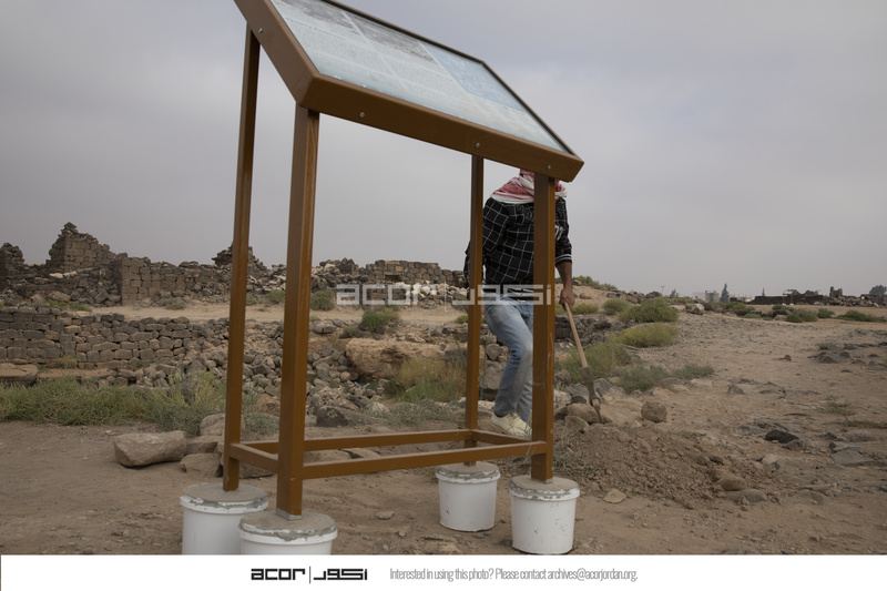 Jordan. Umm al Jimal, Quarry Reservoir interpretive sign sitting in buckets of cement, to be then inserted in the ground by local worker pictured