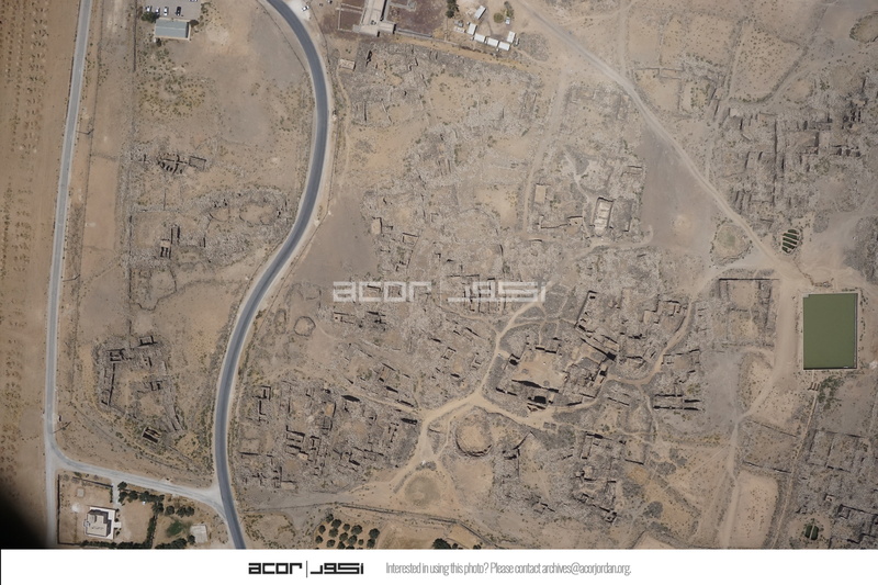 Jordan. Umm al Jimal, aerial view, modern olive tree farm, ancient animal corrals