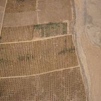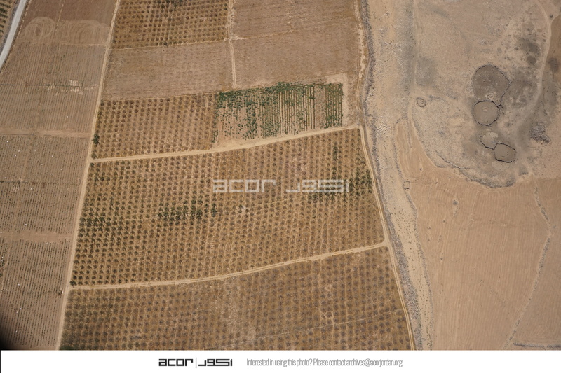 Jordan. Umm al Jimal, aerial view, two farms, with modern olive tree farm in middle, northeast of Umm al Jimal