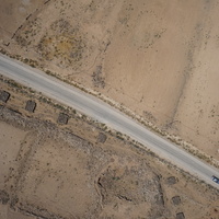 Jordan. Umm al Jimal, aerial view, Northwest Church in bottom left quadrant showing semicircular apse at the bottom