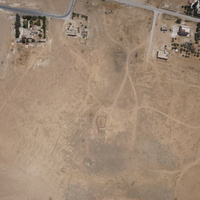 Jordan. Umm al Jimal, aerial photo featuring Umm al Jimal Municipality building in the top right corner, West Church in center, modern shops and school in bottom right corner