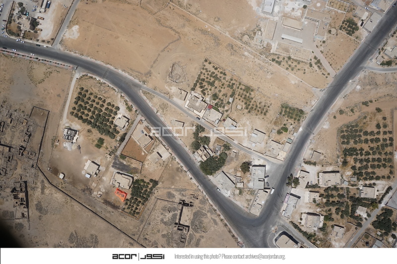 Jordan. Umm al Jimal, aerial view, town on the bottom left of site, flat area west of entry park, Commodus Gate in center