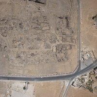 Jordan. Umm al Jimal, aerial view, southwest quadrant of site, bottom right corner is green dome of modern mosque