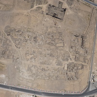 Jordan. Umm al Jimal, aerial photo featuring Interpretive and Hospitality Center on left with white moveable caravans and Barracks
