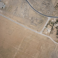 Jordan. Umm al Jimal, aerial view, northern half of picture is the archaeological site, rows of holes in ground were dug to plant trees