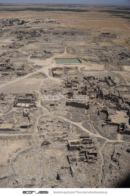 Jordan. Umm al Jimal, general aerial view of ruins with Roman Reservoir in center
