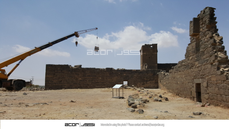 Jordan. Umm al Jimal, exterior of Barracks with chapel at center, entrance to main building on right, crane