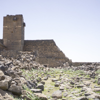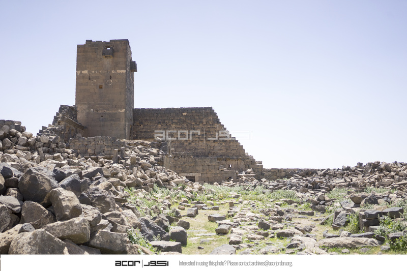 Jordan. Umm al Jimal, view of corner tower from courtyard of Barracks