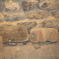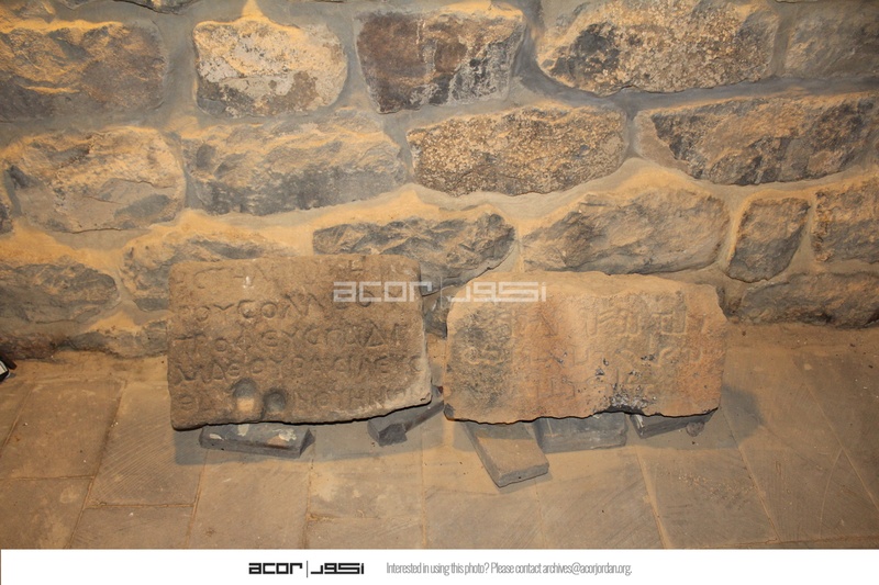 Jordan. Umm al Jimal, Greek inscription on the left, on the right is a Nabataean inscription reading, "memorial stone is for son of Masiq of Ghadima, tanoukh' Fihr, son of Sulleus" which is now on display in the museum