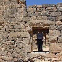 Jordan. Umm al Jimal, Bert de Vries in entryway, stone door to House XVIII