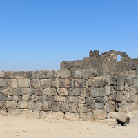 Jordan. Umm al Jimal, Commodus Gate, looking at south guardroom, West Church in background, graffiti