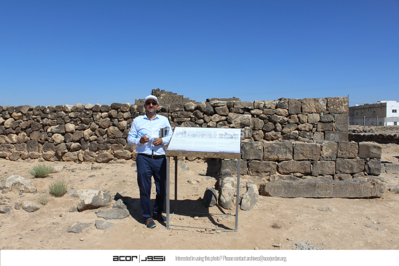 Jordan. Umm al Jimal, Jehad Haron of USAID SCHEP in front of interpretive sign for the West Church