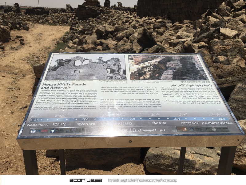 Jordan. Umm al Jimal, interpretive sign for House XVIII facade and reservoir
