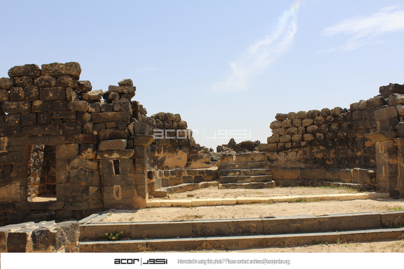 Jordan. Umm al Jimal, Cathedral, altar screen with apse in background, only the priest could cross the white step in the middle and sit on the circular throne