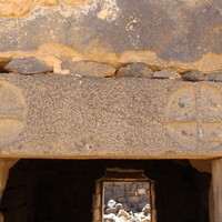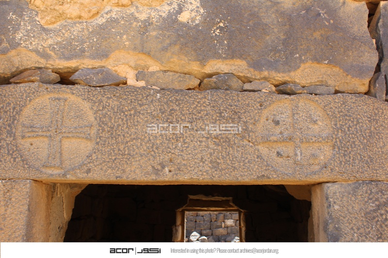 Jordan. Umm al Jimal, cross on the West Church and detail of lintel