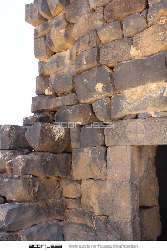 Jordan. Umm al Jimal, the West Church, detail of wall, lintel over doorway with cross