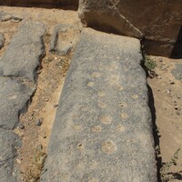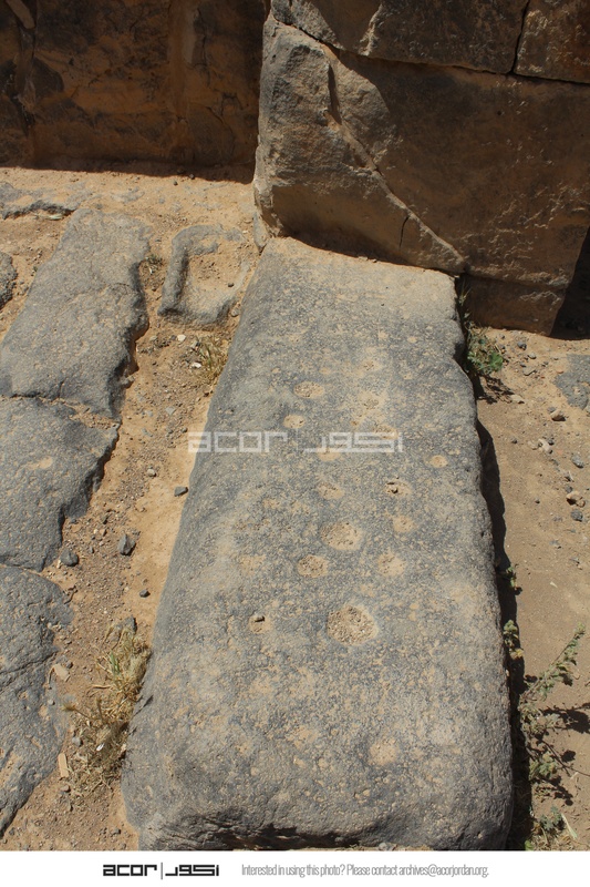 Jordan. Umm al Jimal, doorstep at the main doorway of the Commodus Gate, hinge cup in upper middle, holes thought to have been used for games of Mangala