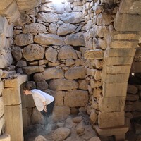 Jordan. Umm al Jimal, great room of House XIII, bathroom in corner