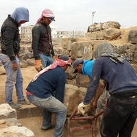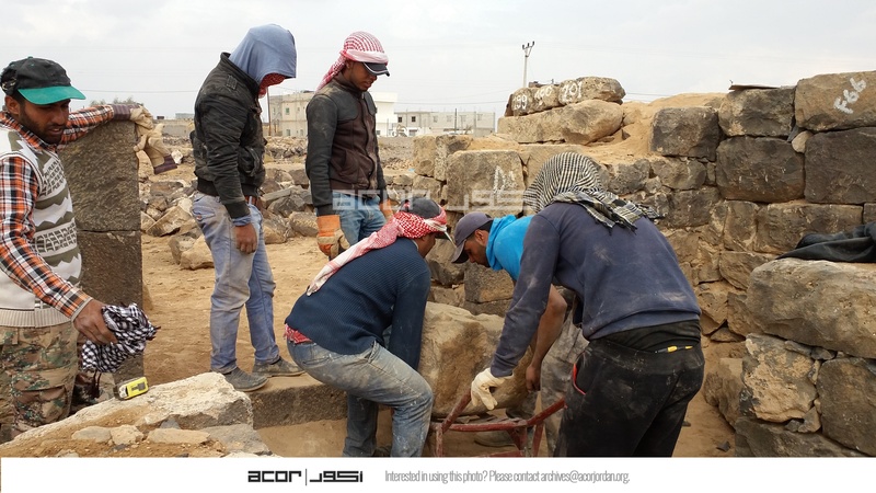 Jordan. Umm al Jimal, local workers working on the restoration of Commodus Gate