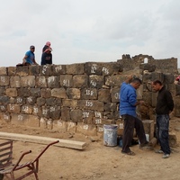 Jordan. Umm al Jimal, local workers working on the restoration of Commodus Gate