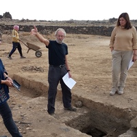 Jordan. Umm al Jimal, excavation of the Commodus Gate, ACOR director Barbara Porter, Bert de Vries, Huda Kilani of USAID SCHEP, local worker in background