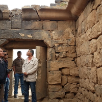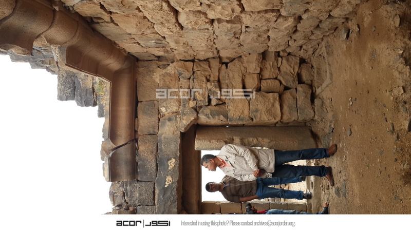 Jordan. Umm al Jimal, interior of room six in House XVIII showing half of stone door in place, in the corner is the opening to the water reservoir in the basement of building, visitors on the left