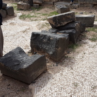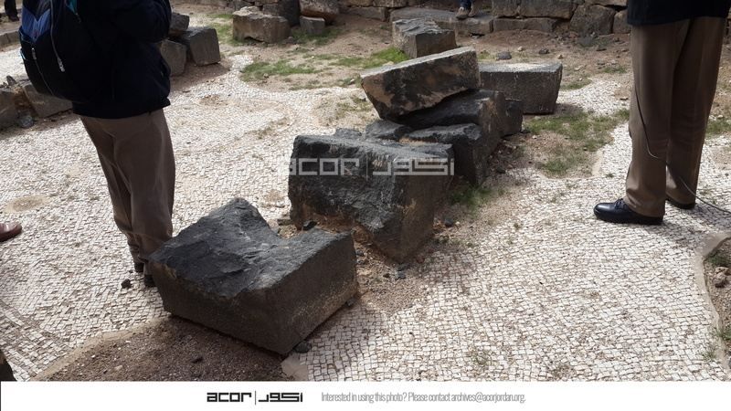 Jordan. Umm al Jimal, mosaic floor of south hall of the Double Church, showing collapsed arch components lying on the floor