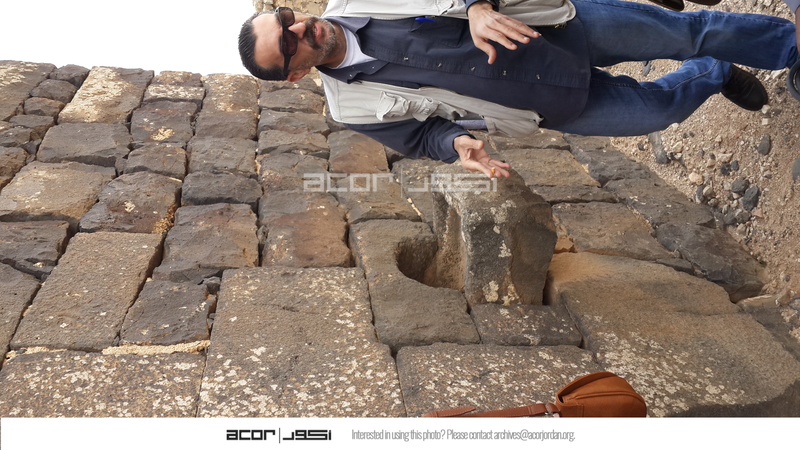 Jordan. Umm al Jimal, Ahmad Lash from the Department of Antiquities describing the holy water basin outside the door of the Double Church