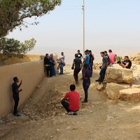 Jordan. Busayra, school group archaeological site visit and pottery activity