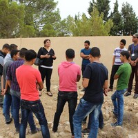 Jordan. Busayra, school group archaeological site visit and pottery activity