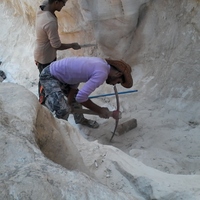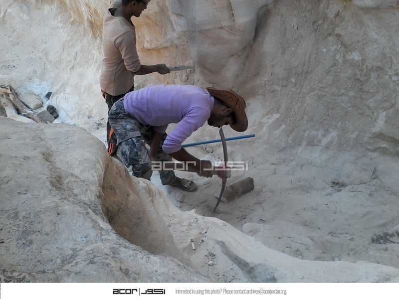 الأردن. وادي عربة، بير مذكور، عمال محليون يقومون بأعمال ترميم في مسار الدليه في طريق البخور القديم بسبب ما حدث له بفعل عوامل التعرية