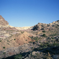Jordan. Petra, helicopter flight with Jane Taylor down to Wadi Sabra, Jane Taylor and Bdoul guide