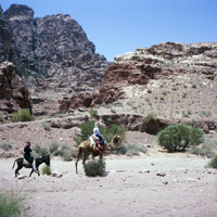 Jordan. Petra, helicopter flight with Jane Taylor down to Wadi Sabra, Jane Taylor and Bdoul guide