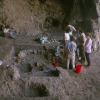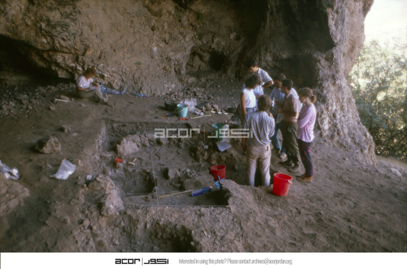 Jordan. Iraq ed-Dubb cave on south side of Wadi Yabis. View of interior of cave to west. People pictured: Adele Tempest, Enzo Bellotti, Ruba Kana'an, Yacoub Oweis, Gaetano Palumbo, Ian Kuijt, Lori Phillips. Excavation of PPNA remains by Ian Kuijt