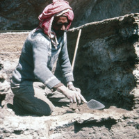 Jordan. Petra, Tur Imdai, local site worker in trench